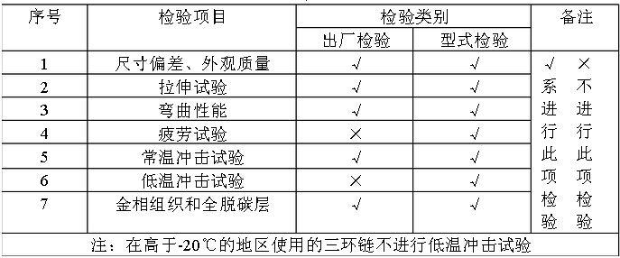 12.4.2 表4中的序號2、3、4、和5為主要項(xiàng)目,主要項(xiàng)目的允許復(fù)檢項(xiàng)目數(shù)為 1項(xiàng),經(jīng)加倍數(shù)量復(fù)檢仍有一掛 (件)不合格,則判定該批三環(huán)鏈為不合格。