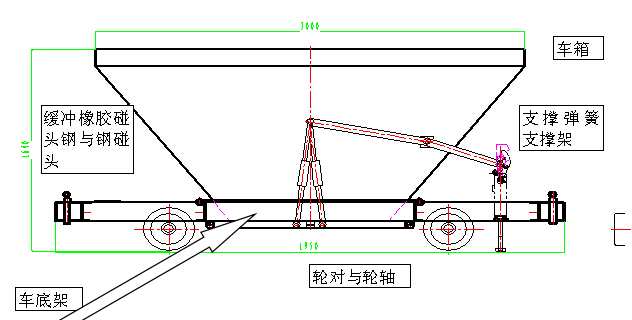 5.3立方米底卸式礦車(chē)卸載采用外力做功,向上頂動(dòng)支撐架頂桿,通過(guò)支撐桿開(kāi)啟卸載底板門(mén)。卸完礦石后,通過(guò)支撐彈簧作用自動(dòng)關(guān)閉卸載底板門(mén)。